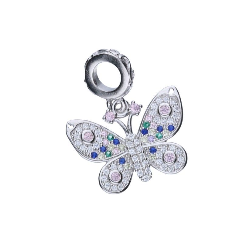 PERLENANHÄNGER, PASST ZU MODULARARMBÄNDERN MIT EINEM MAX. DURCHMESSER VON 3 mm, 925er SILBER RHODIUMBESCHICHTET, BUNTES ZIRKONIA, SCHMETTERLING, ANHÄNGERABMESSUNGEN OHNE BAND 13 mm x 19 mm.