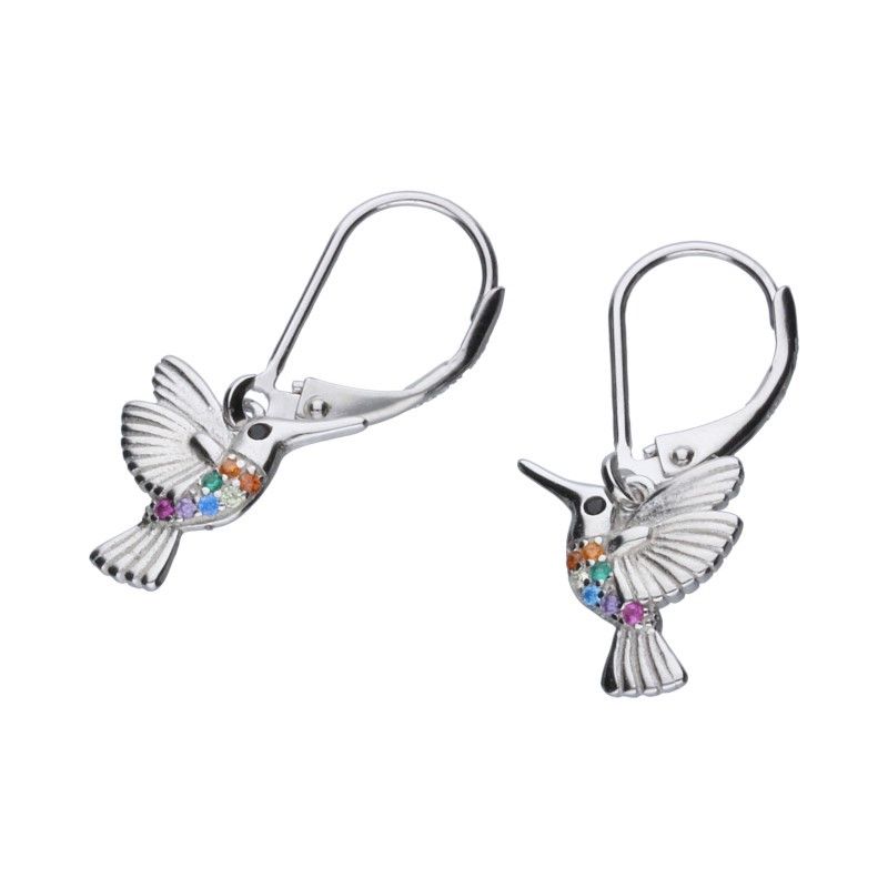 OHRRINGE MIT FRANZÖSISCHEM VERSCHLUSS, 925 SILBER, RHODIUMBESCHICHTET, BUNTE ZIRKONIEN, HUMMMENDE PUNKTE, GRÖSSE 10 mm X 13 mm, OHRRINGLÄNGE 25 mm.