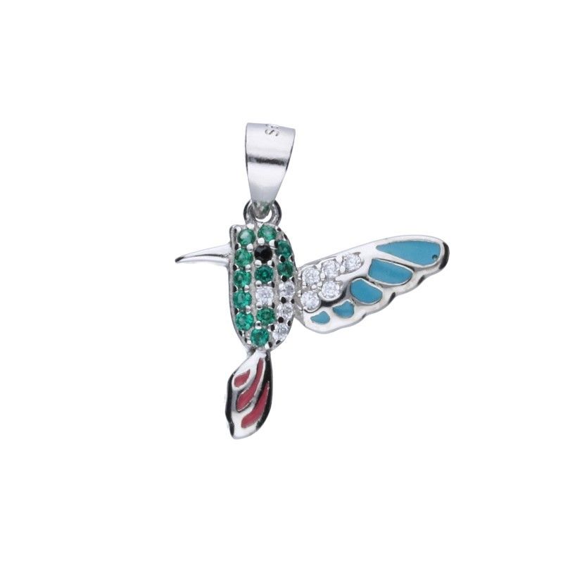 ANHÄNGER AUS 925er SILBER, RHODINIERT, BUNTES ZIRKONIA UND EMAILLE, VOGEL, VOGEL, ANHÄNGERABMESSUNGEN OHNE BAND 15 mm x 17 mm.