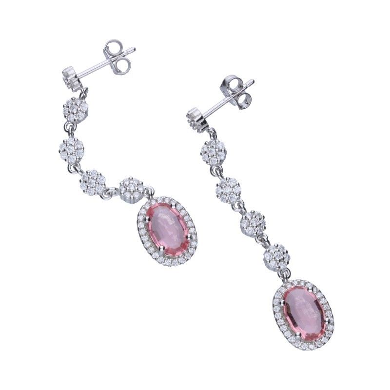 HÄNGE-OHRRINGE, TYP MARQUISE, 925er SILBER, RHODINIERT, WEISSER UND ROSA ZIRKONIA, OHRRINGLÄNGE 46 mm, OVALE ELEMENTGRÖSSE 9 mm x 12 mm.