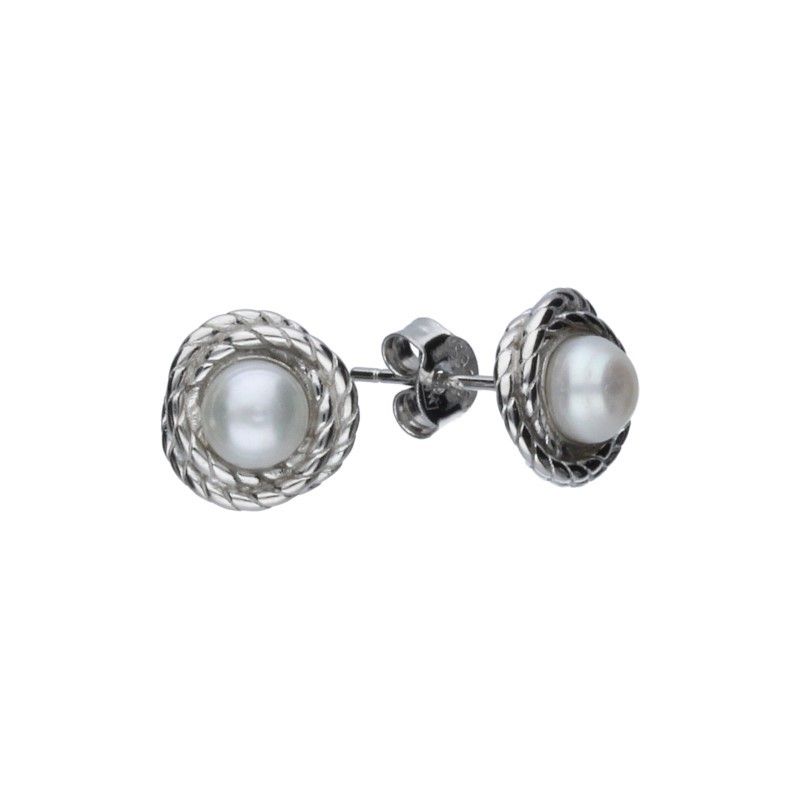 Ohrstecker aus 925er Silber, rhodiniert, Süßwasser-Zuchtperlen, 5 mm Durchmesser, Ohrringeabmessungen 9 mm x 10 mm.