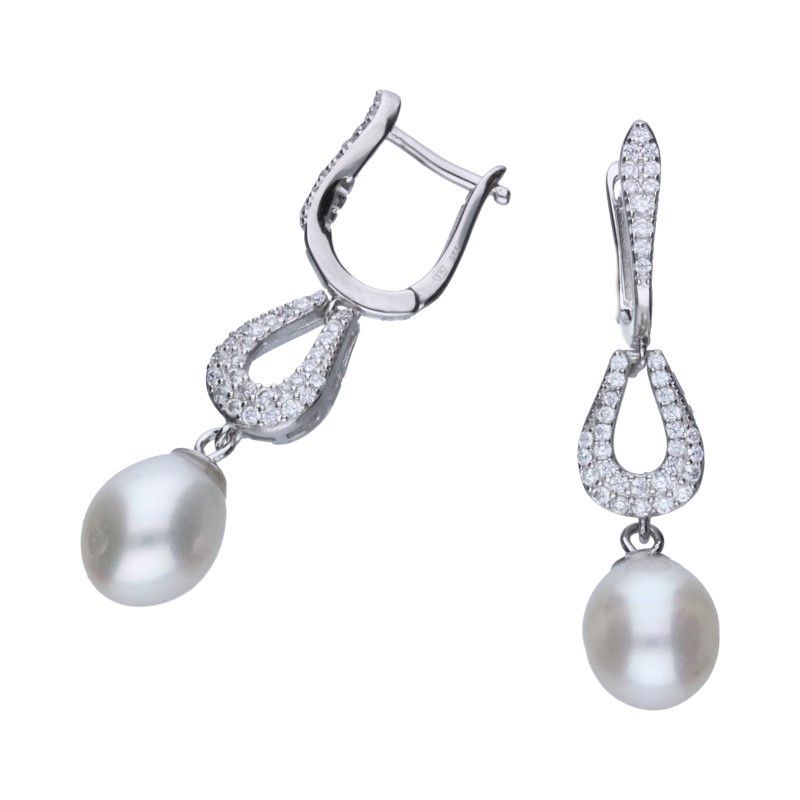 OHRRINGE MIT ENGLISCHER KLEMME, 925 SILBER, RHODINIERT, WEISSES ZIRKONIA, SÜßWASSER-ZUCHTPERLEN, GRÖSSE 8 mm X 10 mm, OHRRINGLÄNGE 37 mm.