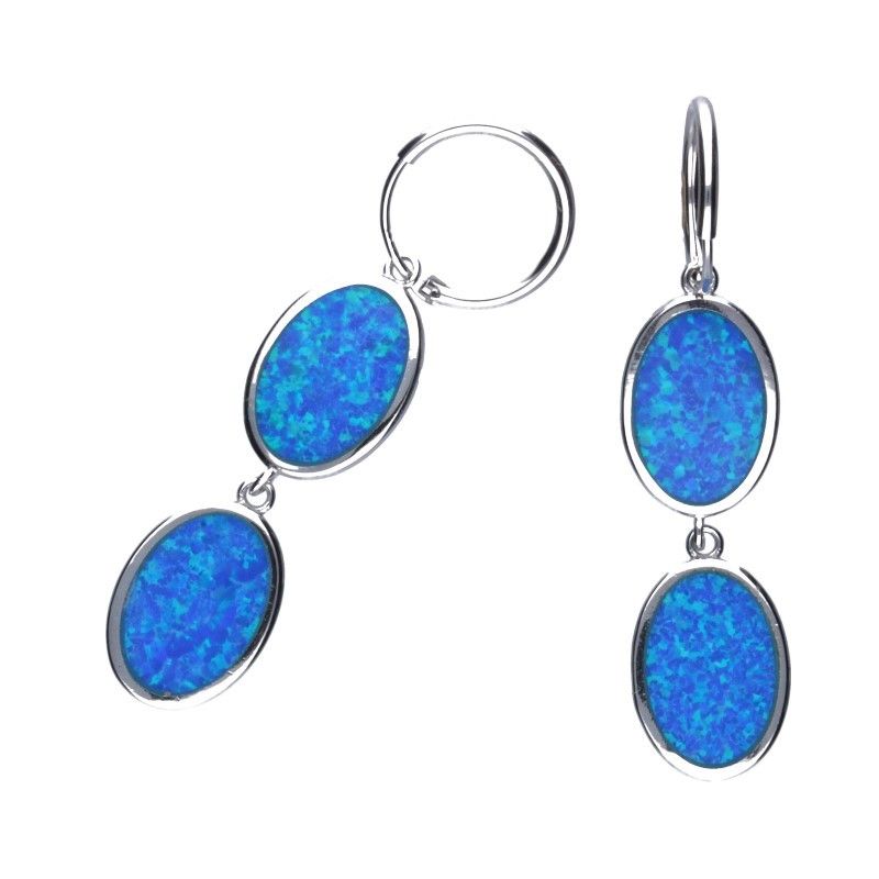OHRRINGE AM RING, DURCHMESSER 12 mm, 925 SILBER, RHODINIERT, BLAUER OPAL, OVAL, GESAMTLÄNGE DER OHRRINGE 43 mm.