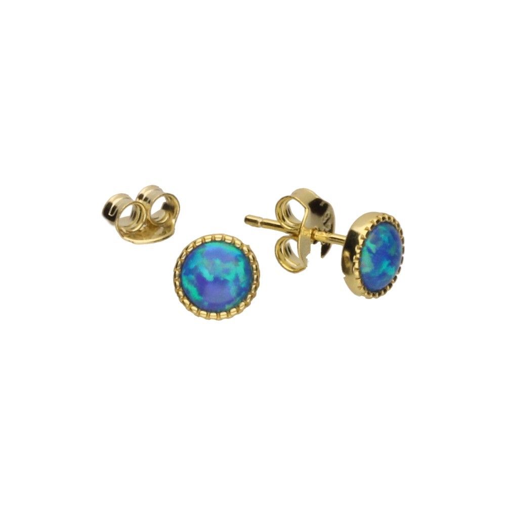 Pick -up -Ohrringe, 925 silbergold -plattiert 24 Karat Gold, blau Opal in einem dekorativen Leuchten, 6 -mm -Ohrringedurchmesser.