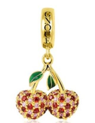 Der Perlenanhänger zum Aufhängen passt zu modularen Armbändern mit einem maximalen Durchmesser von 3 mm, 925 versilbert mit 24 Karat Gold, grüner Emaille, Fuchsia und weißen Zirkonen, Kirschen mit den Maßen 13 mm x 14 mm.