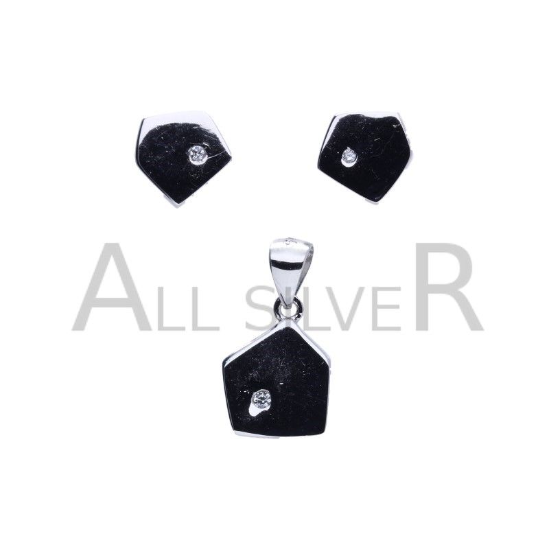 SET AUS OHRSTECKER + ANHÄNGER, WEISSER ZIRKONIA, RHODINIERTES 925ER SILBER. MODERNES GEOMETRISCHES MUSTER.