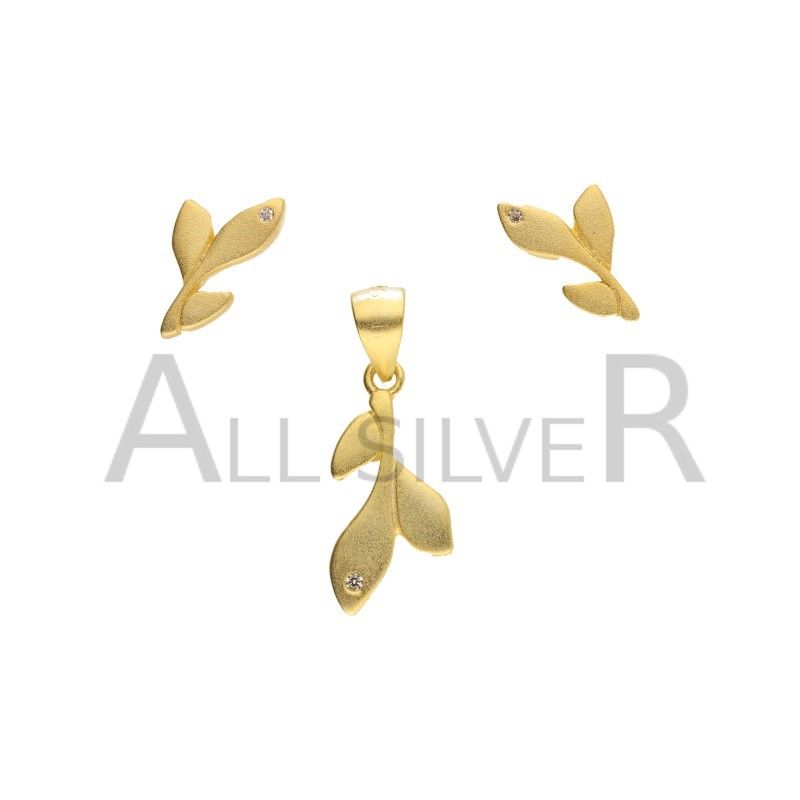 SET – OLIVENZweig, Ohrstecker + Anhänger, weißer Zirkon, vergoldete, sandbeschichtete/satinierte Federblätter aus 925er Silber. BLATT, Zweig.