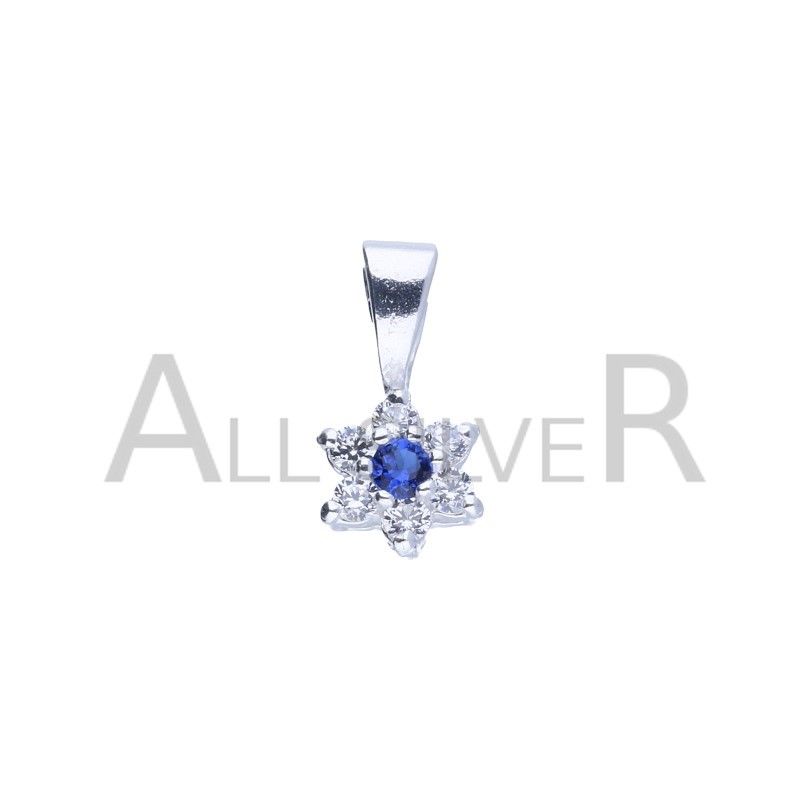 AUSGEZEICHNETER KINDERANHÄNGER, VERSILBERT 925 SILBER, ZENTRALER SAPHIR-ZIRKONIA, KLEINERER WEISSER ZIRKONIA RUNDUM.