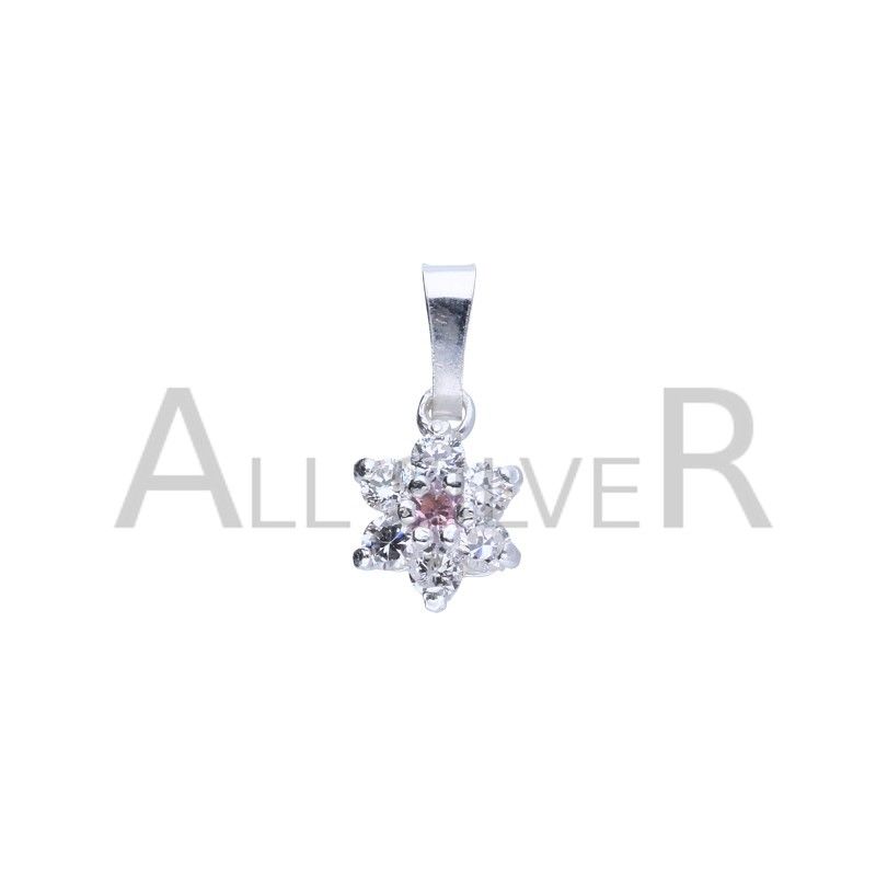 AUSGEZEICHNETER KINDERANHÄNGER, VERSILBERT 925 SILBER, ZENTRALER ZIRKONIA IN HELLROSA, KLEINERER WEISSER ZIRKONIA RUNDUM.