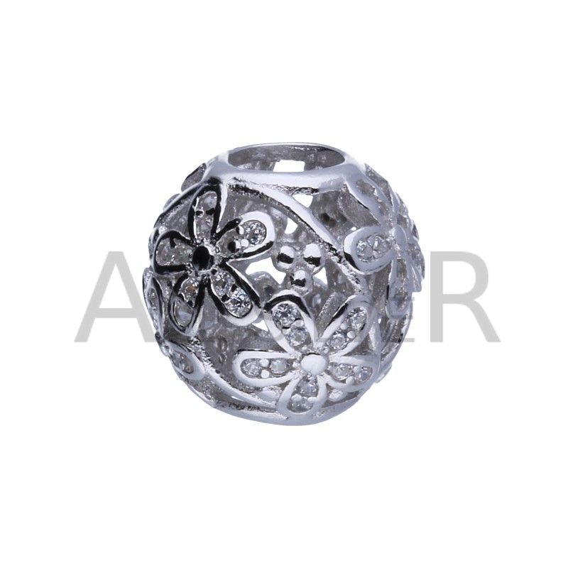 Der durchbrochene Anhänger passt zu modularen Perlenarmbändern mit einem Durchmesser von 3 mm, 925er Silber, rhodiniert, weißer Zirkon, Blumen.