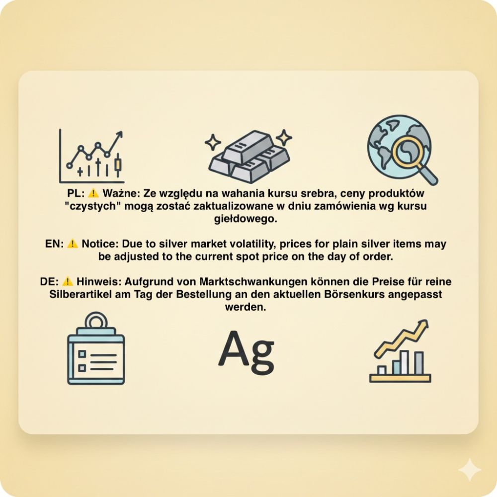 Sehr geehrte Kunden, aufgrund der dynamischen Preisentwicklung am Silbermarkt können die Preise auf unserer Plattform derzeit nicht immer in Echtzeit aktualisiert werden. Bei Bestellungen von reinen Silberwaren (ohne Steine), deren Preis unter dem aktuellen Börsenwert des Rohstoffs liegt, behalten wir uns eine Preisanpassung auf Basis des aktuellen Silberkurses am Tag der Bearbeitung vor.